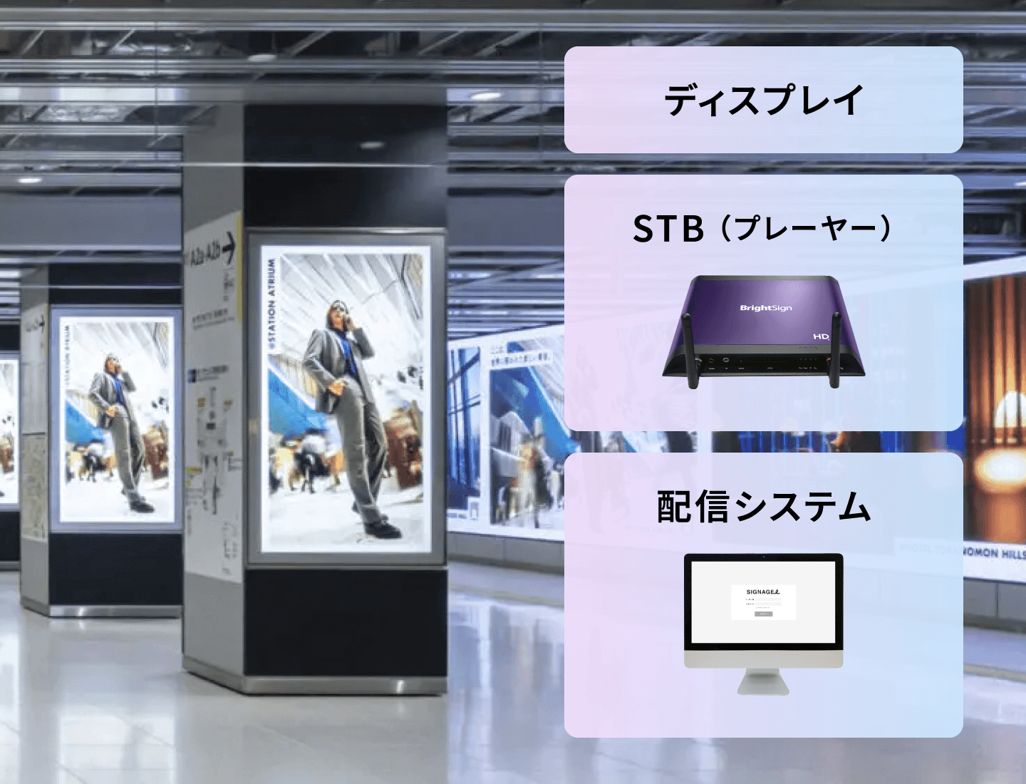 目的やシチュエーションに合わせたディスプレイの選定はもちろん、運用体制を考慮したSTB、配信システムの導入も重要となります。